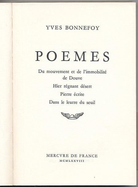 Yves Bonnefoy. Poèmes. Mercure de France, 1978. Bonnefoy (1923-) has been considered to be the leading poet of France after WW II.