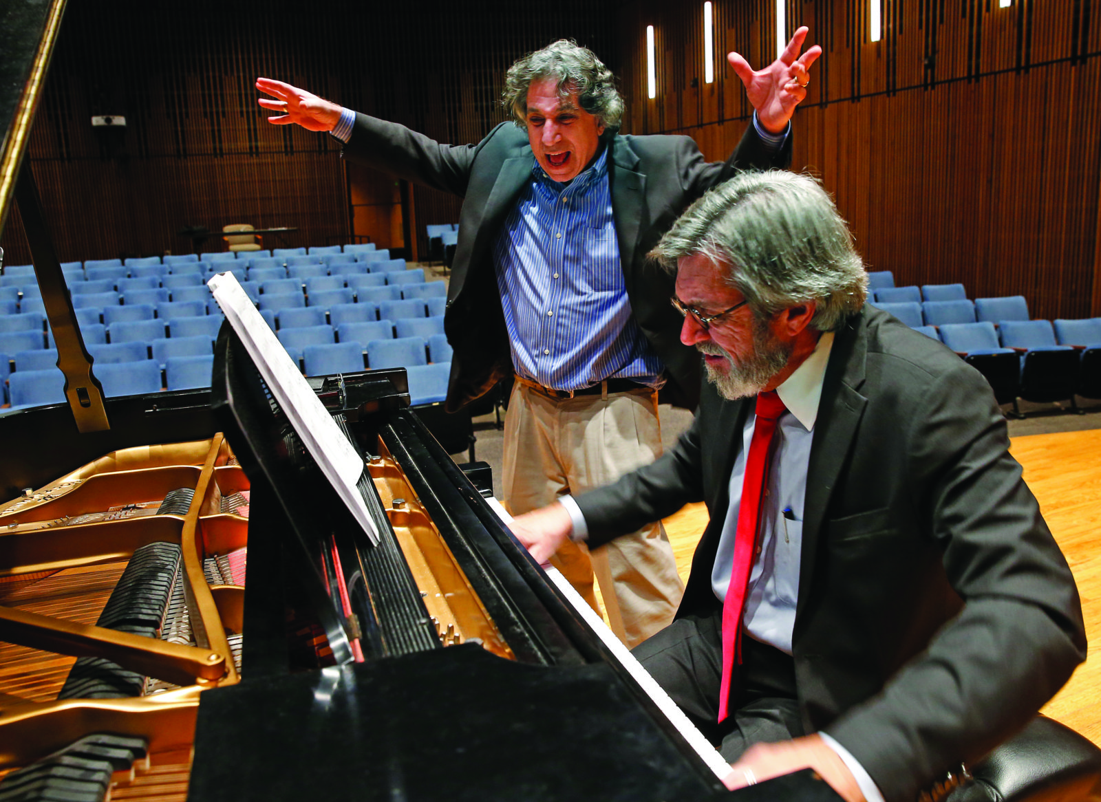 Richard Danielpour, standing, rehearses with Dean Mark Wait at the piano prior to the debut of Danielpour’s Dec. 4, 2012, premiere of 12 new piano études. During Wait’s tenure as dean, the commissioning of new works for faculty artists became central to Blair’s performance mission. (John Russell/VU)