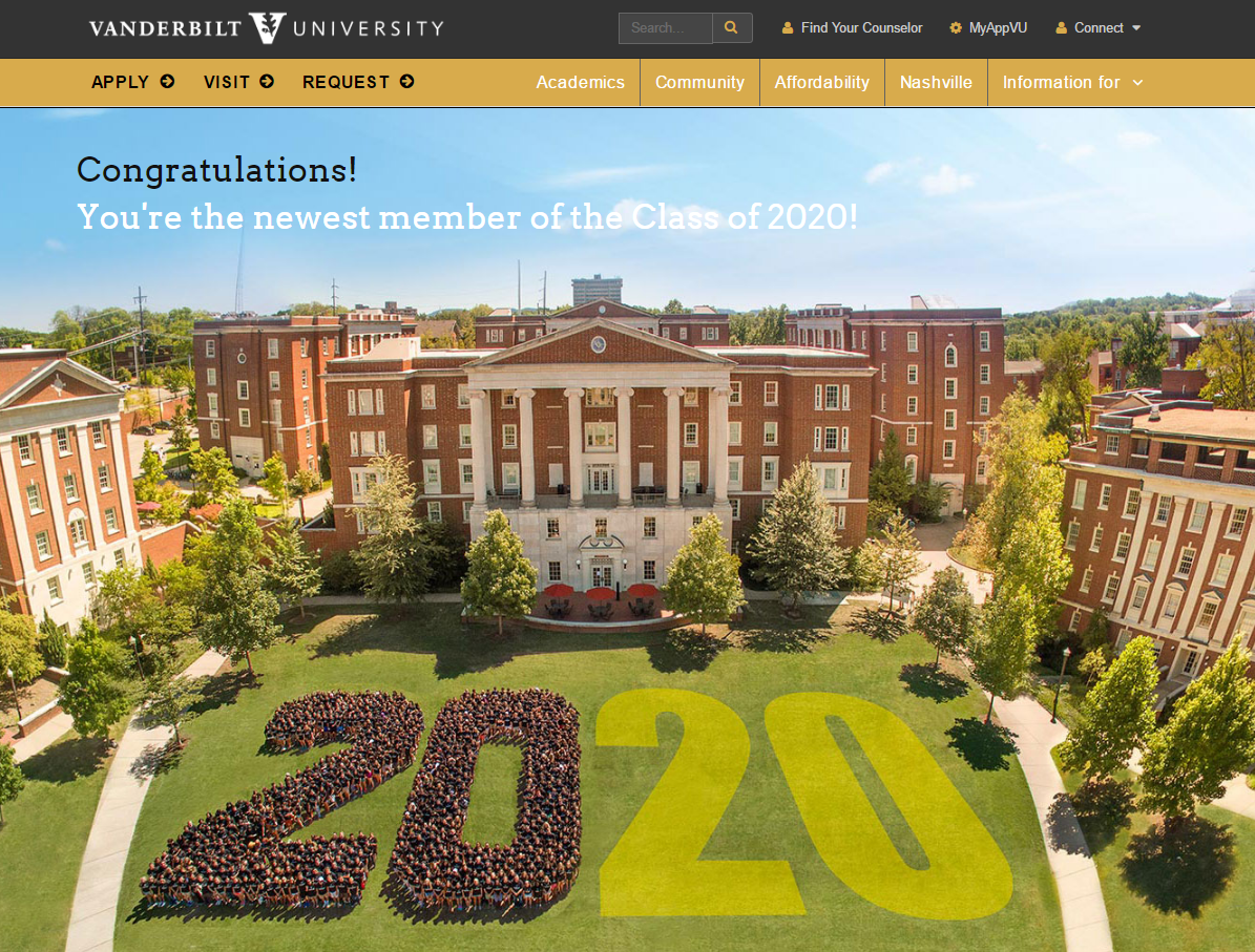 Jun. 3, 2016—University Web Communications was honored with a Silver award by the Tennessee College Public Relations Association during the organization’s spring 2016 conference. The public-facing #VU2020 website is one part of the array of communications that Vanderbilt’s Undergraduate Admissions share with all admitted students. The website provides a snapshot of Vanderbilt for students who are making that final decision...