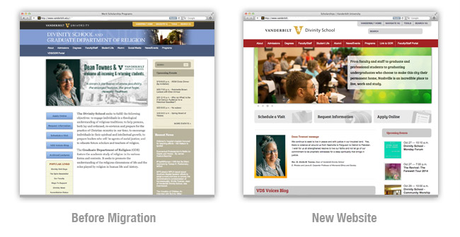 Oct. 18, 2014—The Divinity School went live with a cleaner, more streamlined homepage mid-October. Blog is powered by their VDS Voices my.vanderbilt.edu website Upcoming Events is powered by the  University Calendar Highlighting the message from the Dean each month