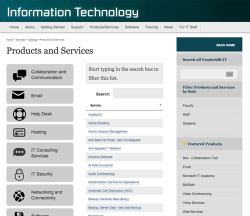 Dec. 7, 2014—We worked with VUIT on simplifying their products and services lookup. VUIT provides many services to the university — and many are known by several different names — and fall into various support groups. We built a simple database that houses all the service/product information, keywords, and groups to which the service might be associated...