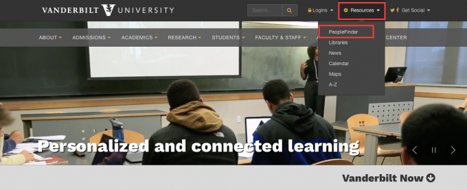 Click on Resources to find the link to People Finder and other campus resources