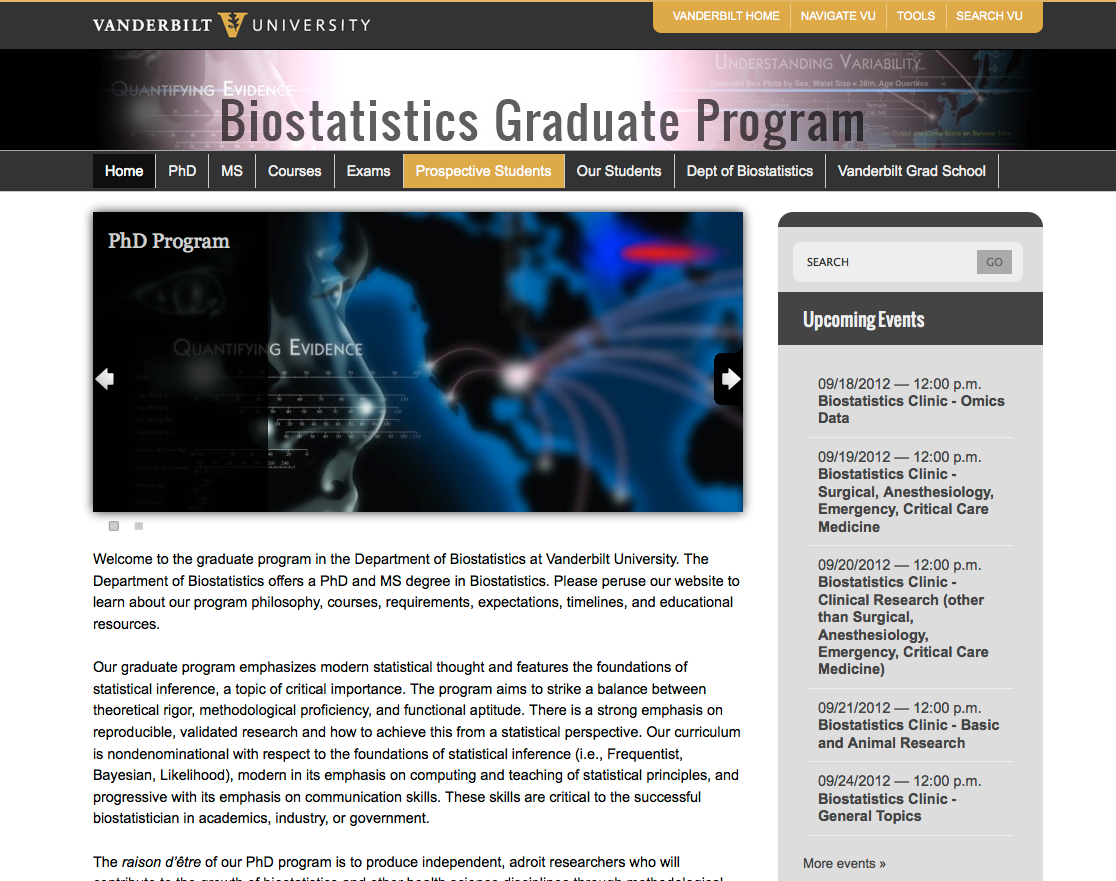 Jan. 5, 2012—The Graduate Program in Biostatistics is a master’s and Ph.D. program housed in the School of Medicine’s Department of Biostatistics and administered by the Graduate School. The program needed a new website to recruit students, provide information for and showcase the work of current faculty and students, and provide information about the field of biostatistics....