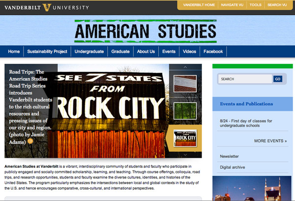 Jun. 28, 2011—The website for the redesigned American Studies site went live June 21. The site also includes information about the American Studies Sustainability Project, a campus-wide program for the 2011-12 year featuring curriculum, speakers, exhibits etc. They wanted a look that felt like Americana with a touch of Hatch Show Print (Hatch does all their Road...