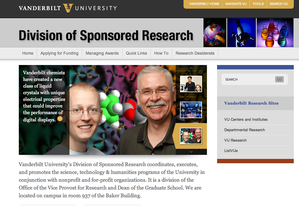 Nov. 11, 2010—We moved the Division of Sponsored Research into our Omni system. The slider on the homepage is a great way to tell the stories of the research that is done here at Vanderbilt.