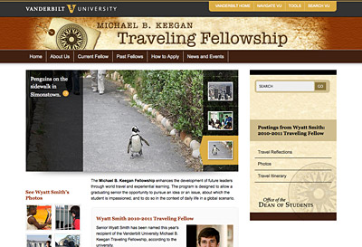 Dec. 3, 2010—The redesigned Michael B. Keegan Traveling Fellowship site launched on December 3, 2010. The site features Flickr photo galleries, online journals and itineraries from current and former Fellows. The program awards $15,000 to allow a graduating senior the opportunity to pursue an idea or an issue, about which the student is impassioned, and to do...