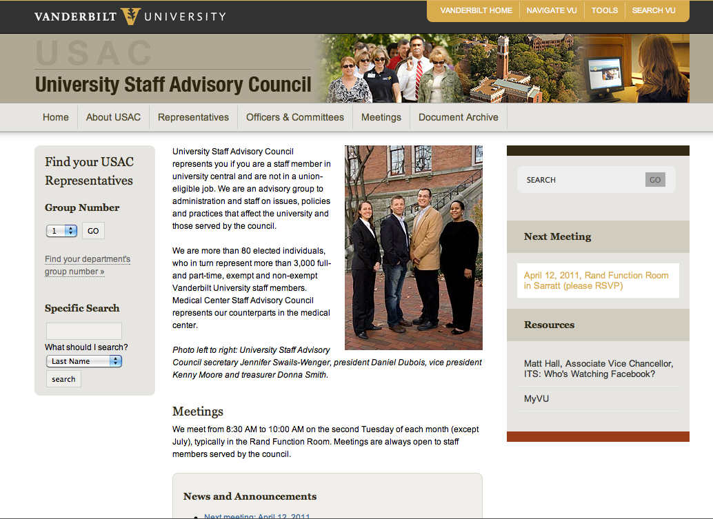 Mar. 15, 2011—The University Staff Advisory Council represents Vanderbilt staff members in university central who are not in a union-eligible jobs. They came to us with the request for a fresh, new look for their website and an easy-to-maintain, centralized database to keep track of their members and committees. We moved them into Omni and created a muted color...