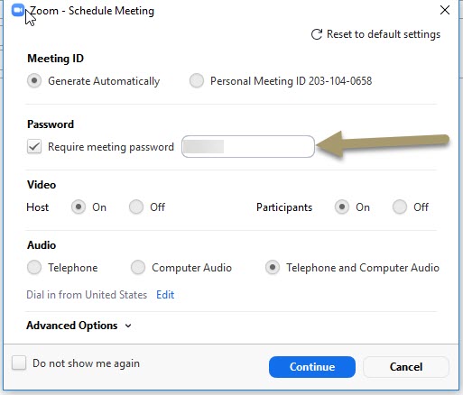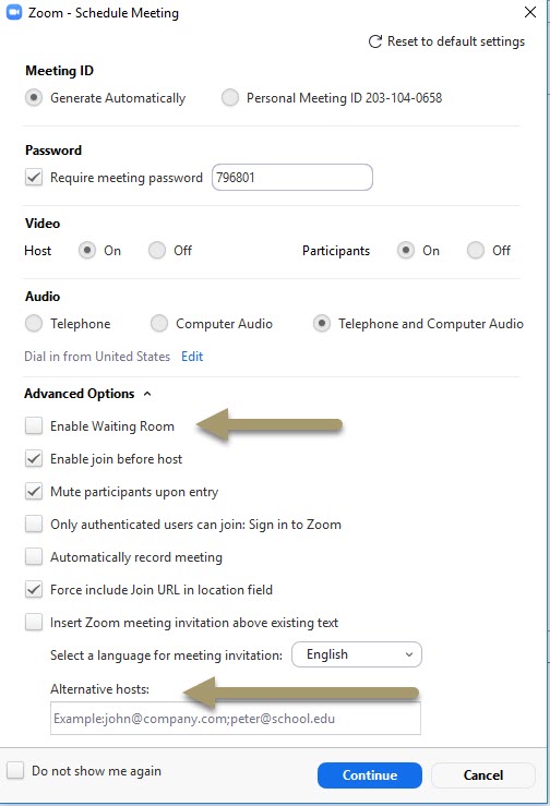 If you click on Advanced Options you will notice you have several options for your meeting. We recommend that you have a Waiting Room so you will know all of your participants. If you have a large meeting, it is recommended to have Alternative Hosts that can help you moderate your meetings.