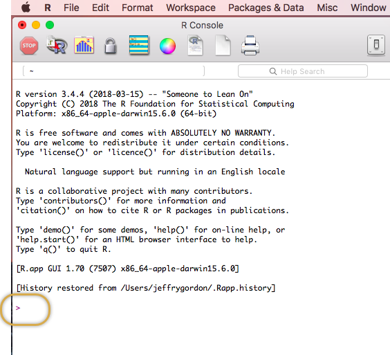 At the prompt type in:  library(Rcmdr) with no spaces. You may copy/paste from here. You will do this EVERY TIME you launch the application. The first time though, it may tell you that you need to download some required packages. Accept the defaults and download those packages. After those packages are downloaded and installed the first time, you will not be asked again to do so.