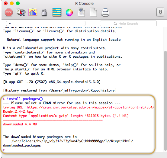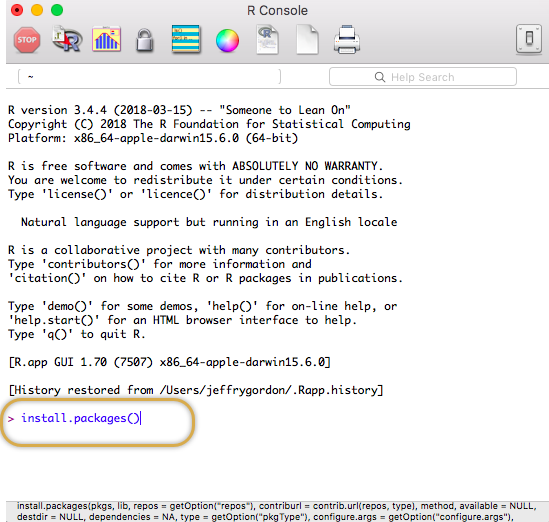 At the prompt, type in (with NO spaces and all in lower case)  install.packages()
