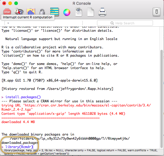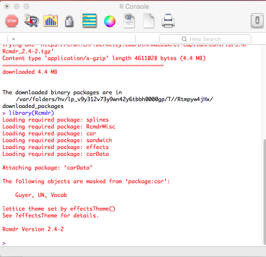 R-Commander has been downloaded and installed. You may be prompted to install additional packages that may not have come down in the most recent package. Go ahead and do that if asked.