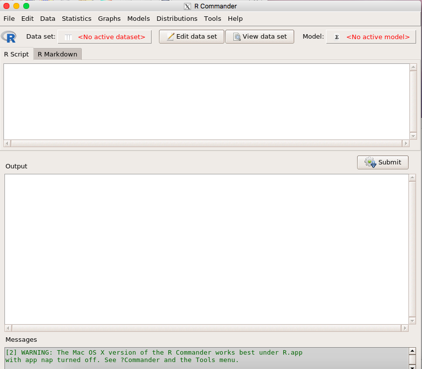 The process for installing R-Commander on your Mac is pretty straightforward. If you are using MacOS 10.11 or higher you will first need to install XQuartz. XQuartz is the environment that R and R-Commander reside in on the Mac.  If your OS is older than 10.11 you may already have XQuartz installed as part of the MacOS (but frankly you shouldn’t be running an OS that old). Go here: