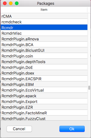 Look for Rcmdr. There will be a number of Rcmdr plug-ins that follow but you are only interested in the first one. Select it and click “OK”.