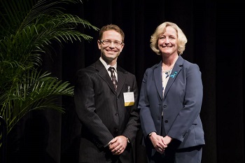 Richard A. Schroeder Chair in Mechanical Engineering Robert J. Webster III (l) is among Vanderbilt’s newest endowed chair holders. Provost and Vice Chancellor for Academic Affairs Susan R. Wente (r) offered opening remarks at Monday’s ceremony honoring the scholars. (Susan Urmy/Vanderbilt University)