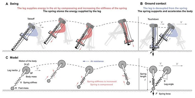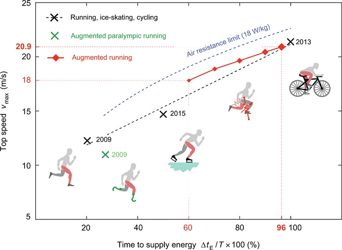 Existing devices with springs, such as jumping stilts, reduce the energy losses when runners step, but do not support the body or allow the legs to move the body forward while in the air, somewhat similar to a bicycle without a seat and a pedal. The new exoskeleton device could not only support the body but also allow the legs to provide energy in the air, so runners can also use all their leg power as when pedaling the bicycle to accelerate — meaning they can run faster than ever.