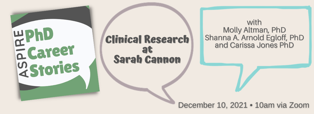 Our December PhD Career Stories will be a panel discussing their clinical research positions at Sarah Cannon, featuring Molly Altman, PhD, Shanna A. Arnold Egloff, PhD, and Carissa Jones PhD.