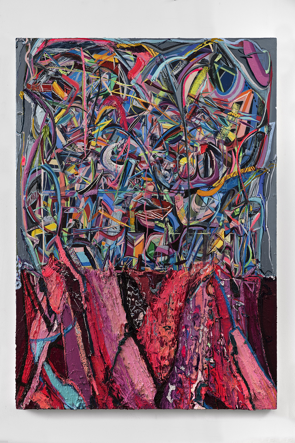 Ali Smith paints vibrant, abstract compositions in oil on canvas whose forms suggest complex organic structures and imaginary landscapes. Her brightly colored and heavily textured networks of lines and forms constitute a personal language of motifs and shapes. Smith received her MFA from California State University, Long Beach (CA), and has since had solo exhibitions at Mindy Solomon Gallery in Miami and Mark Moore Fine Art in Los Angeles. She has been included in numerous group shows, including those at the Laguna Art Museum and Riverside Museum in California. The artist lives and works in Long Beach, California.