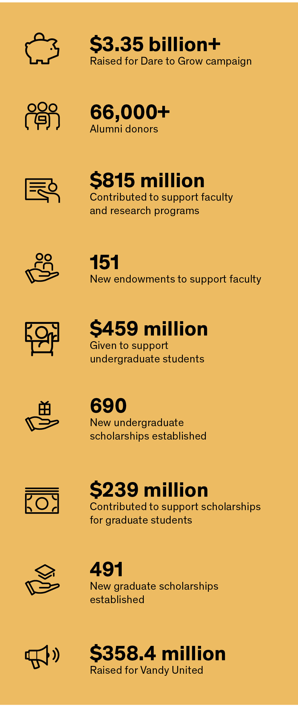 Vanderbilt’s Dare to Grow campaign has surpassed its initial $3.2 billion fundraising goal. In addition to underscoring the incredible generosity of Vanderbilt’s donors and the widespread enthusiasm for the university’s vision, this early achievement has established a launching pad for bolder, more far-reaching impact throughout the remainder of the campaign.