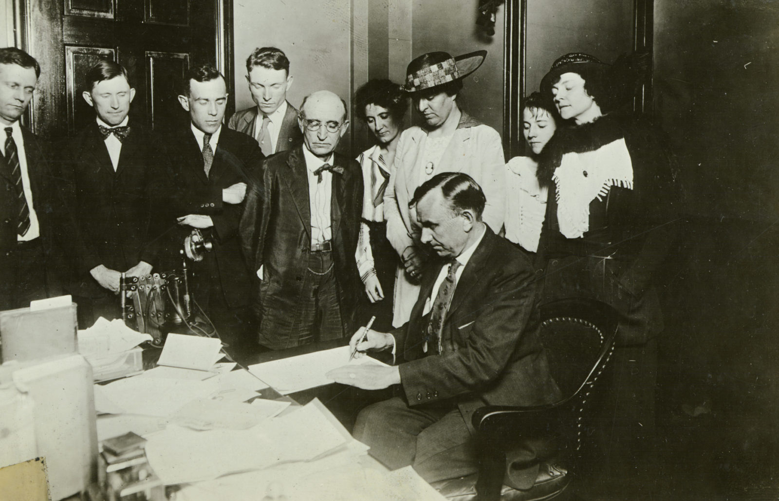 Tennessee Gov. Albert H. Roberts signs the state ratification of the 19th Amendment. (Courtesy of Bryn Mawr College)