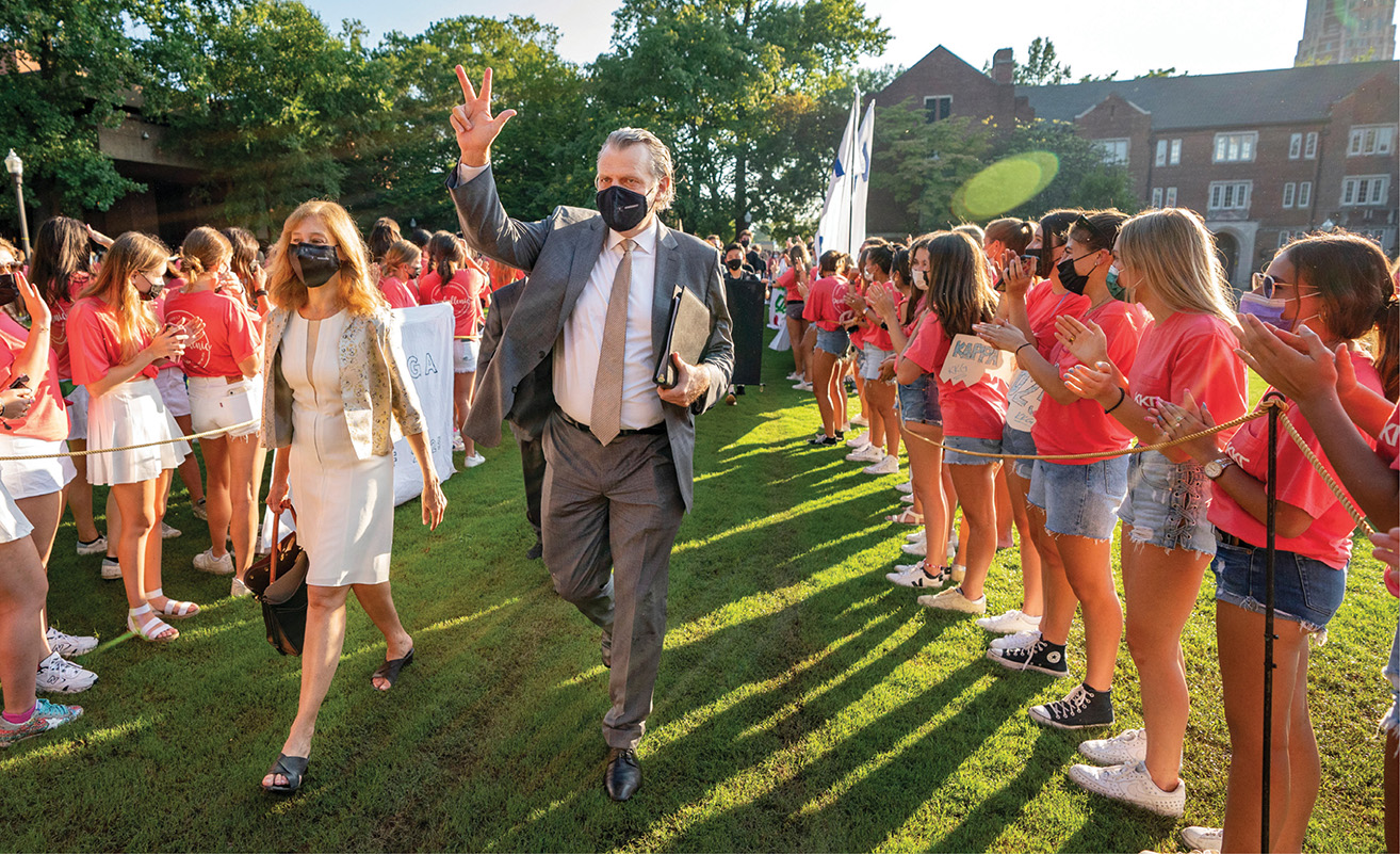 Chancellor Daniel Diermeier and Cybele Raver, provost and vice chancellor for academic affairs, helped lead the procession of first-year, transfer and Next Steps students during Founders Walk on Aug. 22. The annual celebration, which marks the conclusion of Move-In Weekend, officially welcomes the newest members of the Vanderbilt community as they walk across campus from The Martha Rivers Ingram Commons to Alumni Lawn. “Just as we chose you, you chose us,” Diermeier told the students at the event. “Just as we have committed to you, you have committed to us. By virtue of this mutual commitment, you are a full member of the Vanderbilt community from day one. You earned your place. You belong. And we are so glad that you are here.”