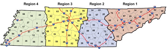 Tennessee’s 95 counties are divided into four TDOT regions. Regional offices are located in Jackson (Region 4), Nashville (Region 3), Chattanooga (Region 2), and Knoxville (Region 1). The map shows the counties within each region, represented by a number. (Tennessee Department of Transportation)