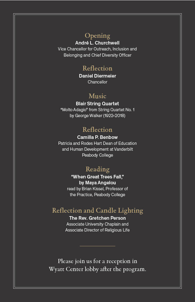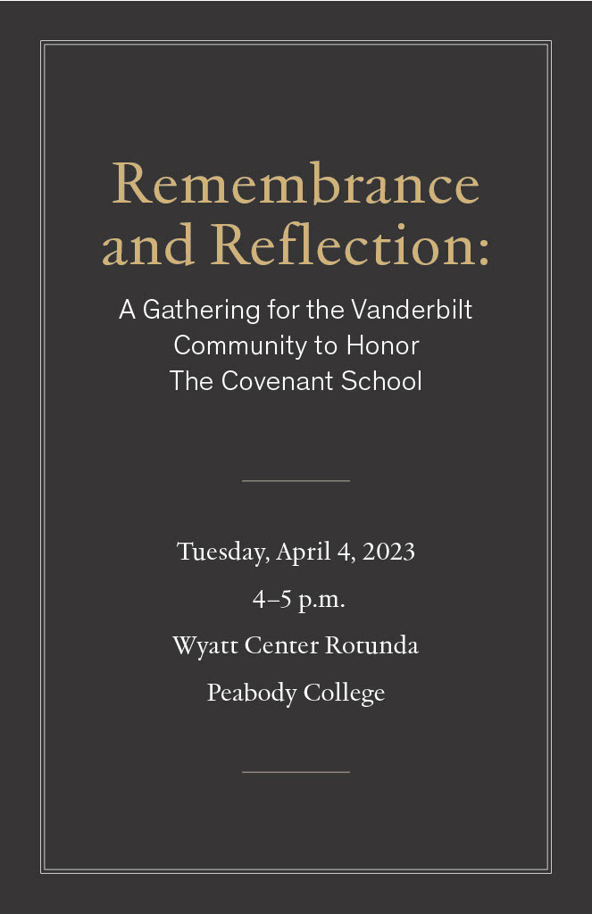 The Office for Equity, Diversity and Inclusion, the Office of the Dean of Peabody College, and the Center for Spiritual and Religious Life will host a gathering for Vanderbilt community members and the public to honor those lost in the recent tragedy, as well as to come together to reflect. “Remembrance and Reflection: A Gathering for the Vanderbilt Community in Honor of The Covenant School” will be Tuesday, April 4, at 4 p.m. in the Wyatt Center Rotunda, with a reception to follow. If you have questions, please contact Linzie Treadway, director of special projects in the Office for Equity, Diversity and Inclusion, at linzie.treadway@vanderbilt.edu.