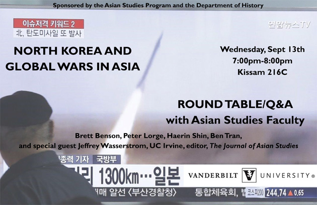 Panelists will include Vanderbilt’s Brett Benson, Peter Lorge, Haerin Shin and Ben Tran, with special guest Jeffrey Wasserstrom, Chancellor’s Professor of History at the University of California at Irvine, who has participated in congressional briefings about North Korea and China. He is also the editor of The Journal of Asian Studies.