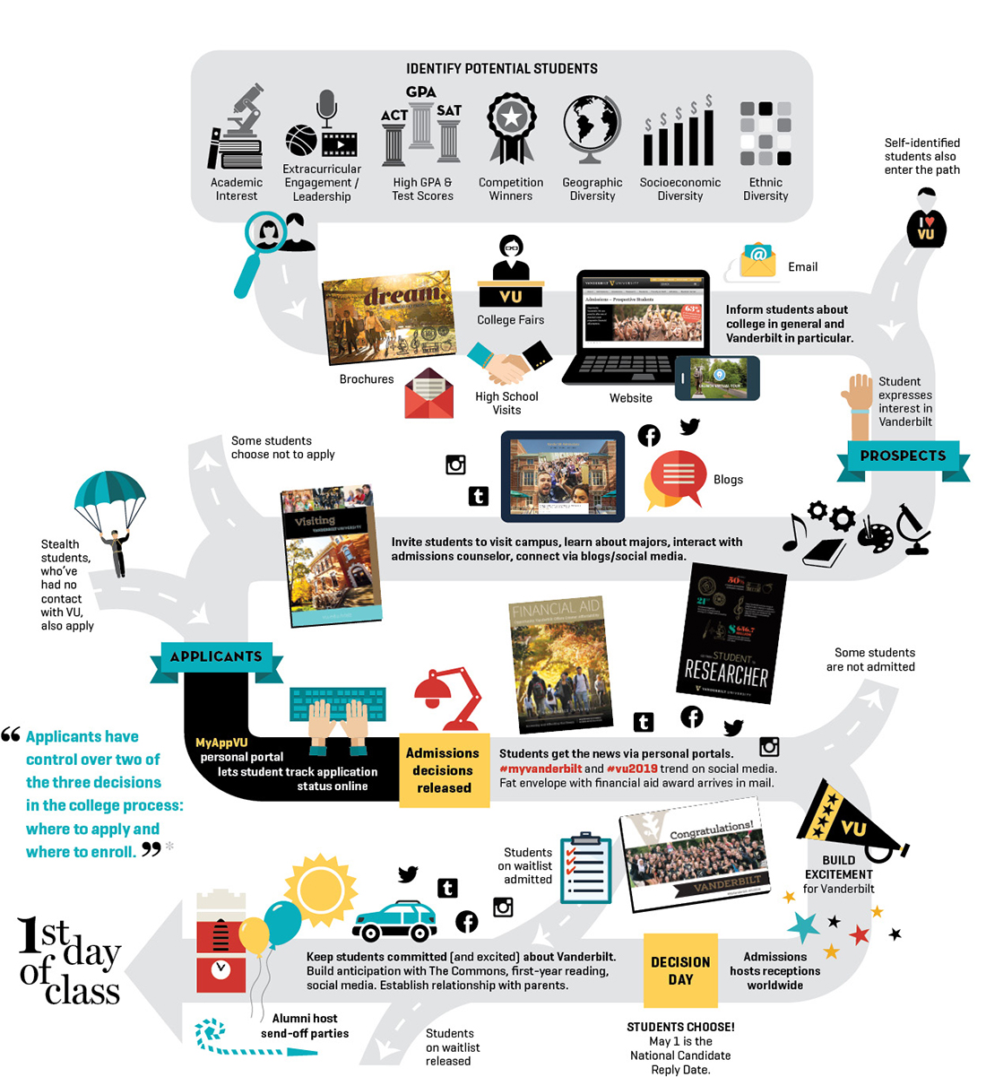 Vanderbilt’s Office of Undergraduate Admissions is communicating with as many as 1 million students, ranging from ninth grade (some even younger) through 12th grade. Knowing how and when to target the largest possible set of high-potential applicants—using a full range of interactions—to build the best first-year class possible takes strategic planning and smart execution. Here’s an inside look at how it’s done.