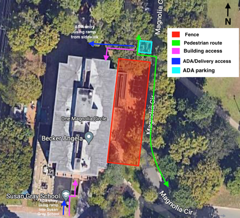 ADA access will be available on the south side of the building through the Susan Gray School entrance ramp and on the northeast side using the ramp coming down from Magnolia Circle. Due to the location and the need to ensure the safety of children at the school, accessible entry to the Susan Gray School/One Magnolia Circle will need to be coordinated in advance. Staff and faculty should contact Equal Opportunity and Access, and students should contact Student Access.