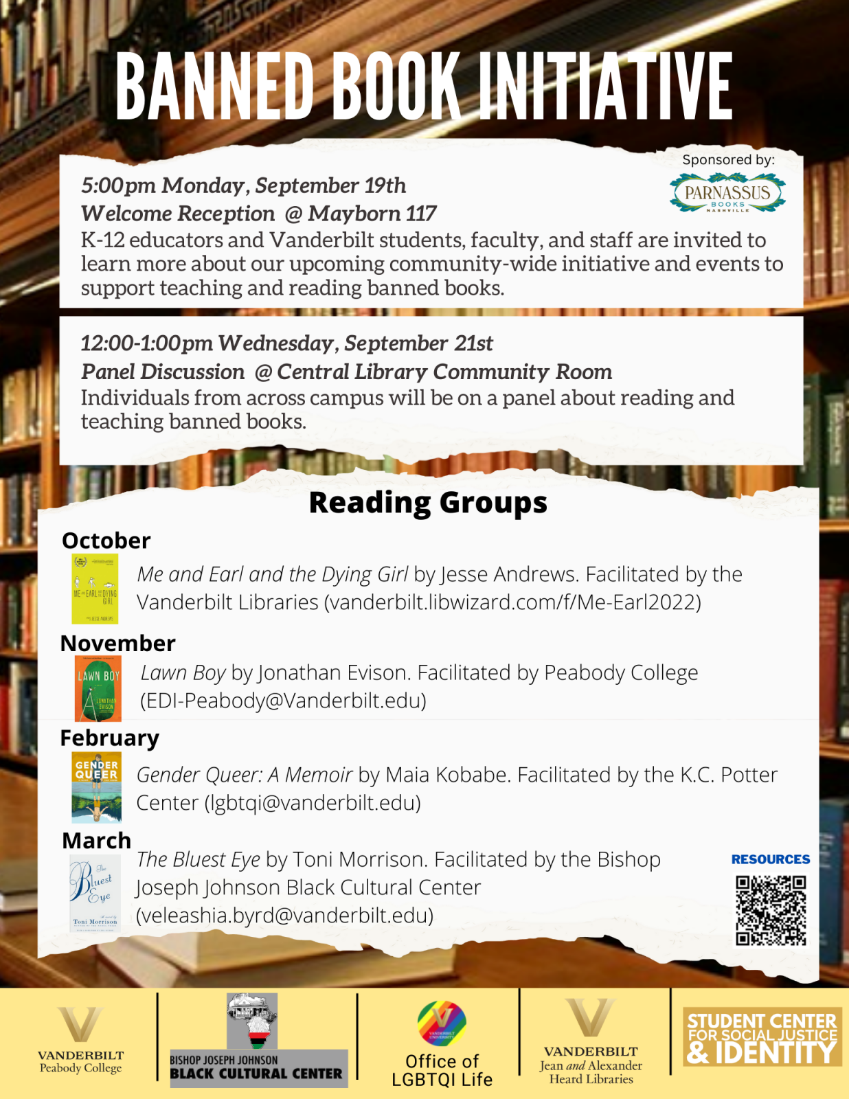 The second event will be a panel discussion on Wednesday, Sept. 21, from noon to 1 p.m., in the Central Library Community Room. The panel discussion will include Emily Pendergrass, associate professor of the practice of literacy education; Matthew Shaw, assistant professor of law and assistant professor of public policy and education; and Brianna Newhouse, current Vanderbilt student and future teacher. Information about monthly reading groups and their facilitators also will be provided.