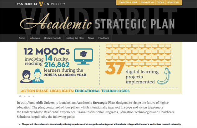 The website for Vanderbilt’s Academic Strategic Plan has been updated to promote some of the major accomplishments achieved thus far and to preview programs and initiatives in development.
