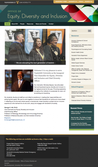 The website includes information about Hill and the office, links to a wide variety of campus resources related to equity, diversity and inclusion, and a comment form for visitors to submit comments, suggestions and questions. It will continue to grow and evolve to provide comprehensive information about equity, diversity and inclusion at Vanderbilt.