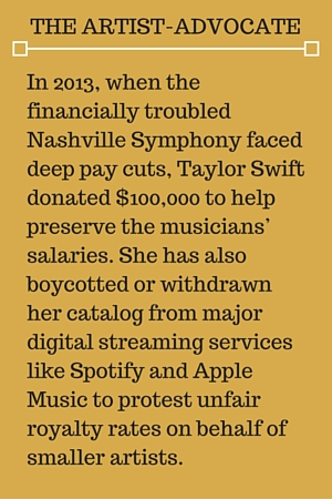 Taylor Swift sidebarThe artist advocate works to influence policies, economic conditions or industry practices that affect musicians, for example, as an artistic trade unionist. Artist-advocates tend to view these broader structural impediments as the greatest threat to a musical career, what Cornfield calls an impersonal risk orientation.