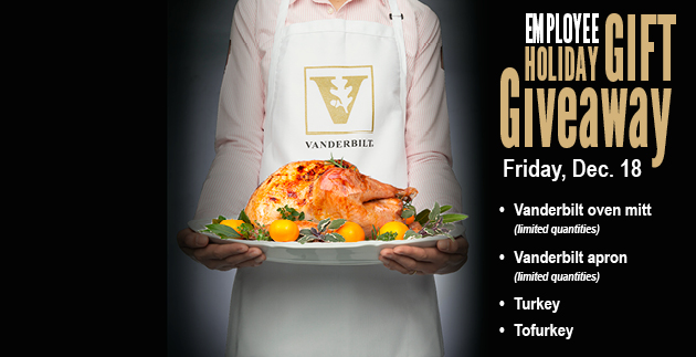 Vanderbilt’s 2015 Holiday Gift Giveaway is scheduled for Friday, Dec. 18. Employees can choose a Vanderbilt apron, oven mitt, turkey or tofurkey.