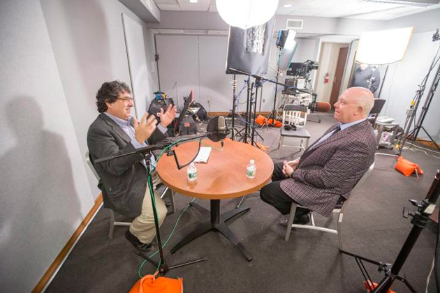 (L-r) Chancellor Nicholas S. Zeppos interviews political scientist John Geer for "The Zeppos Report." (John Russell/Vanderbilt)