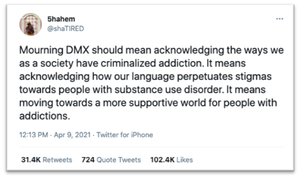 “It gives me goosebumps to read that,” said Welch. “A sentiment that was coughed up by the internet, shared over 28,000 times because DMX on some level succumbed to a lifelong substance abuse struggle. And I thought, ‘Wow. That is pretty substantial discourse to be encountering ambiently on Twitter … because a celebrity passed away.’”