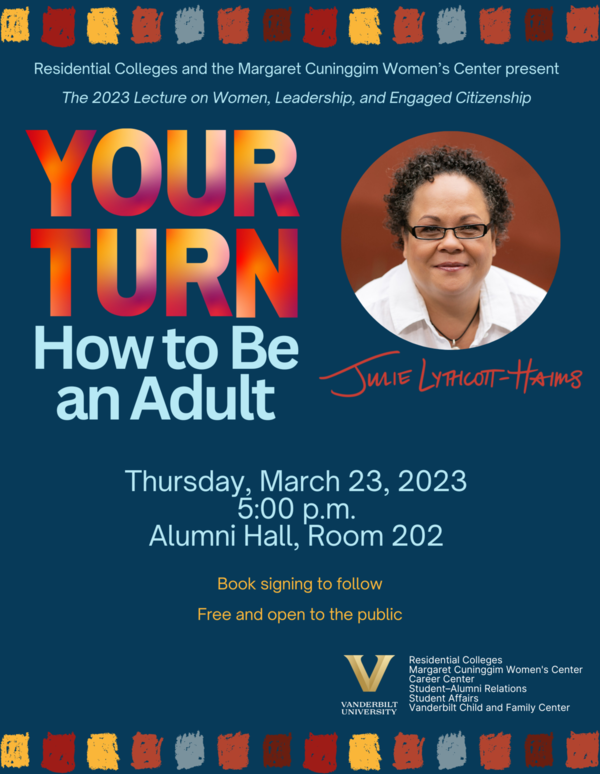 Vanderbilt’s residential colleges and the Margaret Cuninggim Women’s Center will host New York Times bestselling author Julie Lythcott-Haims later this month; Lythcott-Haims will be a Patterson Fellow and will deliver this year’s lecture on women, leadership and engaged citizenship. The lecture, “Your Turn: How to Be an Adult,” will be on Thursday, March 23, at 5 p.m. in Alumni Hall, room 202. The Career Center, Student–Alumni Relations, Student Affairs and the Vanderbilt Child and Family Center are co-sponsoring Lythcott-Haims’ visit to Vanderbilt.