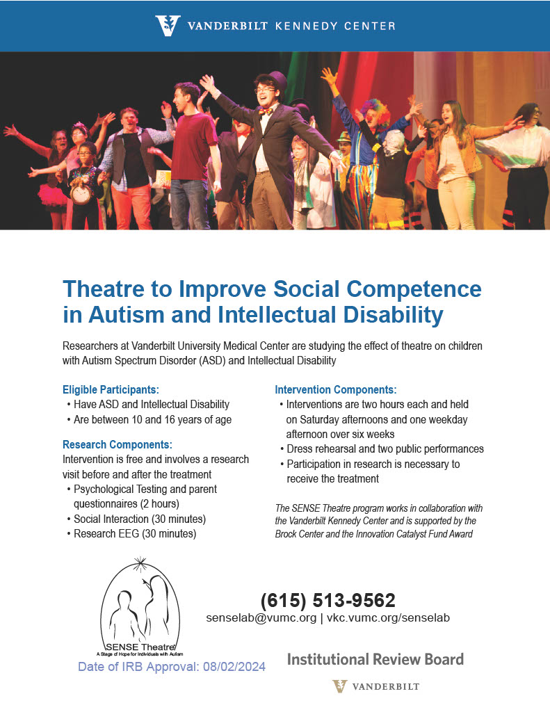 Researchers at Vanderbilt University Medical Center are seeking children and adolescents between the ages of 10 and 16 years old who have been diagnosed with an autism spectrum disorder (ASD) and intellectual disability (ID) to participate in a research study examining the effect of theatre on children with ASD and ID.