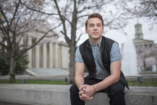 Connor D. Henderson is an Ingram Scholar. He was photographed at Nashville’s War Memorial Building and Legislative Plaza. (John Russell/Vanderbilt)