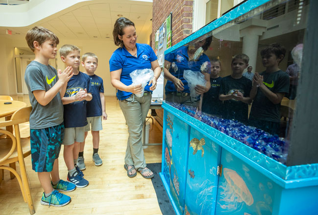 Tennessee Aquarium’s Senior Aquarist Sharyl Crossley introduced the jellyfish to their new home at the Wyatt Center on Aug. 14. Pictured with Crossley are (from left) Liam Dixon (son of Amanda Dixon, Admissions Coordinator, SSMV); and Isaac and Aaron Eeds, sons of Angela Eeds, director of SSMV). (John Russell/Vanderbilt)