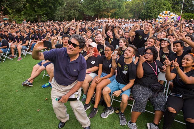 Chancellor Nicholas S. Zeppos takes a selfie with members of the Class of 2022 at Founders Walk on Aug. 19. (Anne Rayner/Vanderbilt)