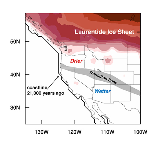 However, 21,000 years ago, at the peak of the last Ice Age, a period known as the Last Glacial Maximum, the Southwest was wetter than it is today – much wetter – and the Northwest was drier – much drier.