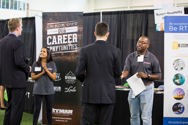 More than 2,000 Vanderbilt students met with 400 recruiters representing some 140 companies at the Vanderbilt Career Center’s 2018 Career Fair held Sept. 5 at the Student Rec Center fieldhouse. From those initial meetings, students were invited to participate in more than 200 interviews with companies the following day.