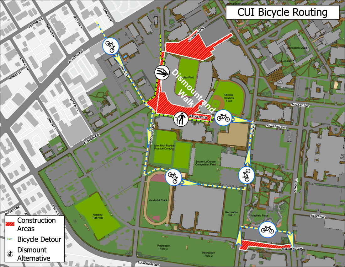 - Non-dismount access to campus will remain open by detouring along Vanderbilt Place and Children’s Way.