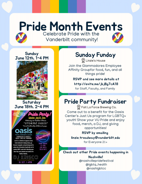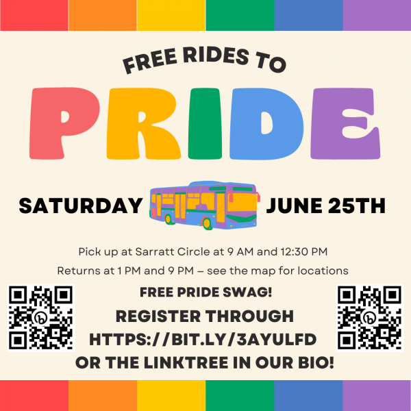 The K.C. Potter Center is offering free shuttle rides to and from the Nashville Pride parade and festival, so come get free Pride swag and ride in style with the Vanderbilt community. Shuttle rides are available to students, faculty and staff.