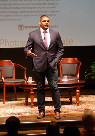 Sam relayed that story—from growing up impoverished in tiny Hitchcock, Texas, to playing football at the highest level for two NFL teams—during a Feb. 16 talk in Sarratt Cinema. The event was part of the Vanderbilt Chancellor’s Lecture Series.