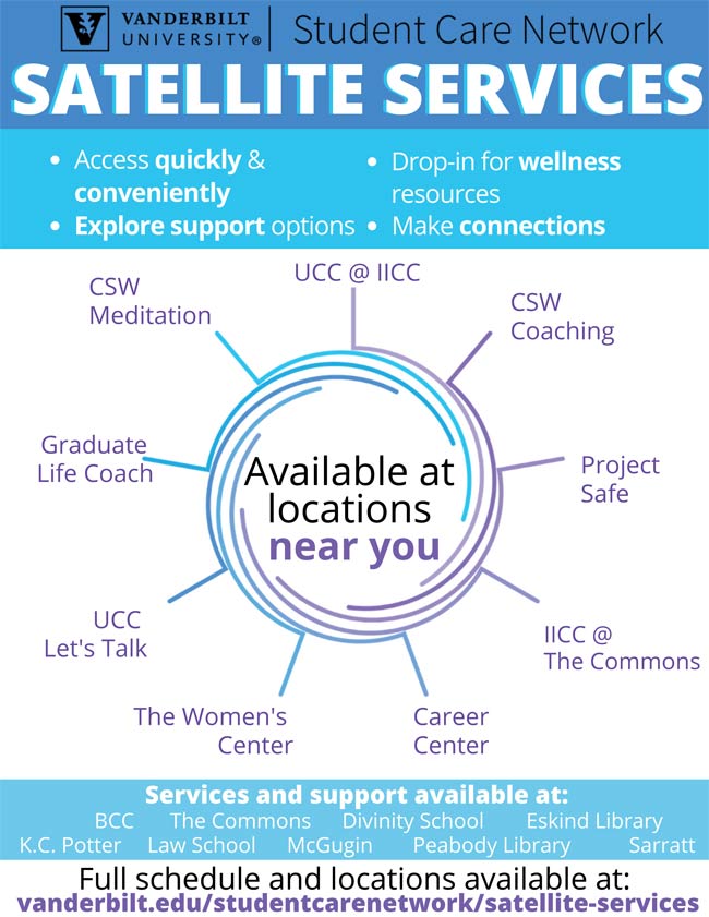 An online calendar now features health and wellness services offered in satellite locations across campus. Satellite services give students quick and convenient access to resources in locations near them. Locations may rotate based on student feedback but currently include Sarratt Student Center, The Martha Rivers Ingram Commons, Black Cultural Center, K. C. Potter Center, Inclusion Initiatives and Cultural Competence, Eskind Biomedical Library, Peabody Library, Law School, Divinity School and the McGugin Center. Students are encouraged to check the online calendar for a full listing of the services and locations.