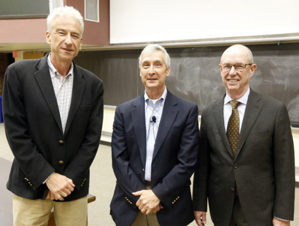 The speakers were, from left, Graduate School Dean Mark Wallace, Ph.D., who discussed how defects in multi-sensory processing in the brain can hamper social and communication skills in children with autism; Laura Dugan, M.D., director of the Division of Geriatric Medicine, who described the role of inflammation in neurodegenerative disorders like Alzheimer’s disease; and Sachin Patel, M.D., Ph.D., director of the Division of Addiction Psychiatry, who studies the role of endocannabinoid signaling in stress-related neuropsychiatric disorders.