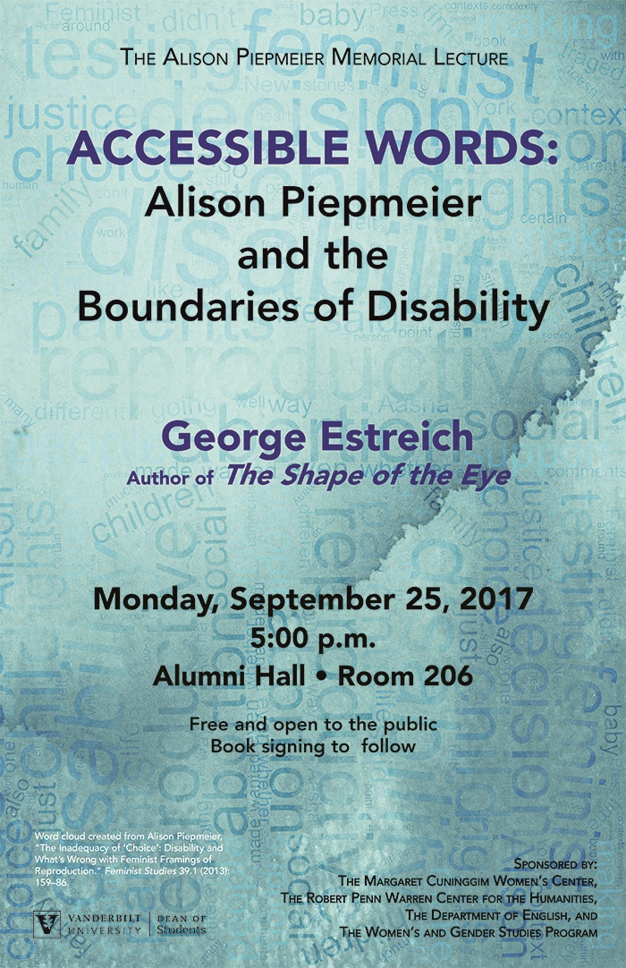 Giving the Alison Piepmeier Memorial Lecture—titled “Accessible Words: Alison Piepmeier and the Boundaries of Disability”—is George Estreich, instructor in the School of Writing, Literature and Film at Oregon State University, poet, and author of the 2011 award-winning book The Shape of the Eye, a memoir about raising his daughter who has Down syndrome. The lecture is free and open to the public.
