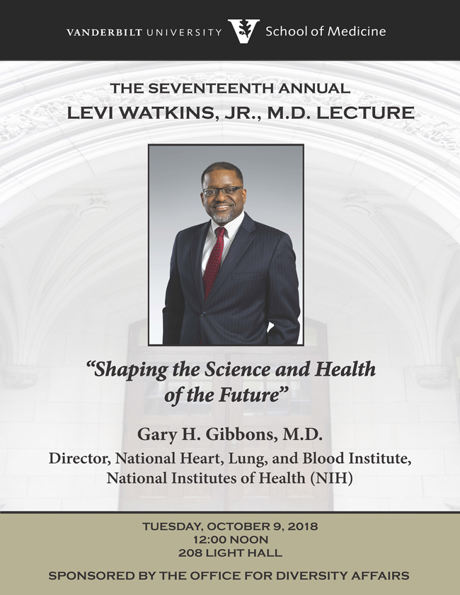 Gary H. Gibbons, director of the National Heart, Lung and Blood Institute of the National Institutes of Health, will present “Shaping the Science and Health of the Future” at noon Tuesday, Oct. 9, in Light Hall, Room 208. Gibbons’ talk is the 17th annual Levi Watkins Jr., M.D. Lecture sponsored by the School of Medicine’s Office for Diversity Affairs.